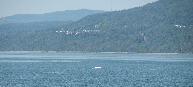 We left Cap de l'aigle under power and ran right in to belugas. Quite a sight. We're not supposed to be within 400m of Belugas but we blundered right into them. Stopped and let them move on. They are are bright white under the summer sun. Wind picked and we sailed, the river is deep and wide here, we don't have to follow the channel markers anymore. We get to Tadoussac, and we're 4 miles out when we take down the sails. We motor to the harbor but I screwed up on our arrival time. The tide is on ebb and it takes 4 hours to go 4 miles. The ebb tide is running over 6 mph and we can't make headway. We watch the buoy lights and head for them but they just don't get any closer. We basically get no where until the tide changes. We have a spot reserved in the marina but the guy gives us the slip information and goes home.
